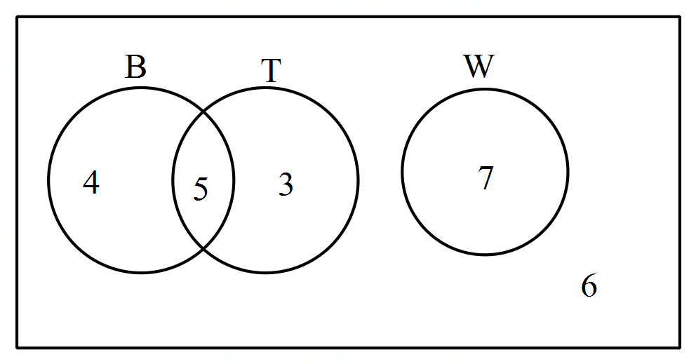 Question 3 of 5The adjacent Venn diagram shows 25 people who travel to work. B = bicycle, T = train, W = walk. Write down which events are mutually exclusive.