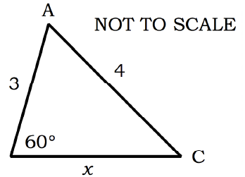Question 7 of 13In \(\Delta ABC\), AB = 3, AC = 4 and \(\angle ABC = {60^o}\) and BC = \(x\). Find the exact value of \(x\).