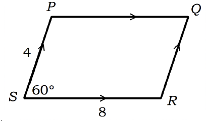 Question 8 of 13PQRS is a parallelogram, PS = 4, RS = 8 and \(\angle PSR = {60^o}\). Find the exact length of the diagonal QS.